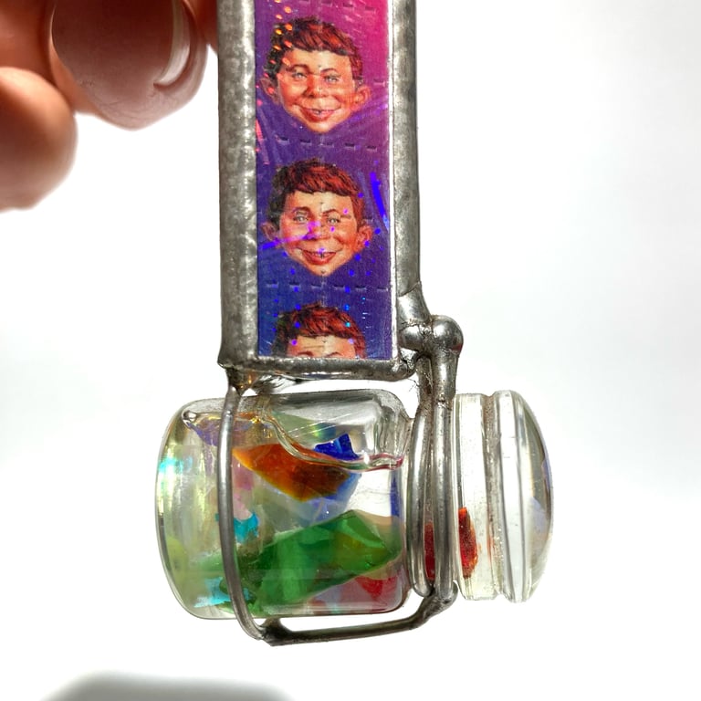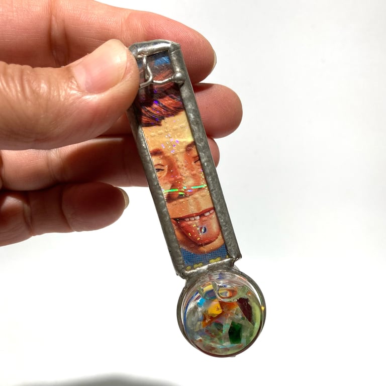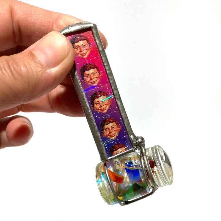 This kaleidoscope necklace is made from holographic blotter art, with a glow in the dark rainbow jar that twists to create the visuals inside. It includes a 30" stainless ball chain and mini uv light to charge the glow, and is super fun to carry with you at all times for a new perspective in life ;)