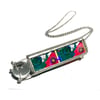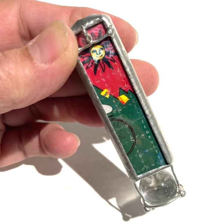 This kaleidoscope necklace is made from holographic Bicycle Day blotter art printed by Zane Kesey, with a clear glass marble on the end.