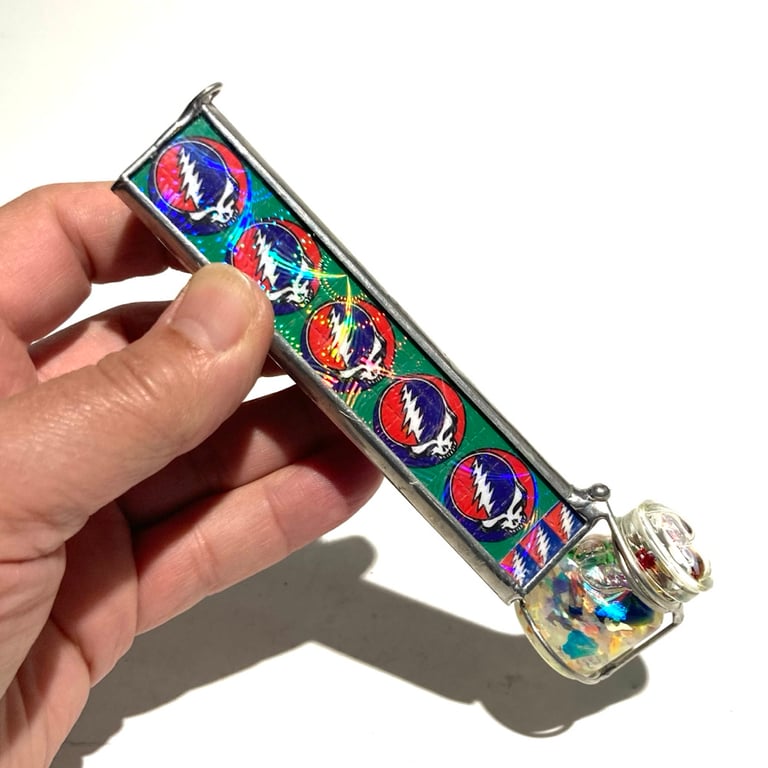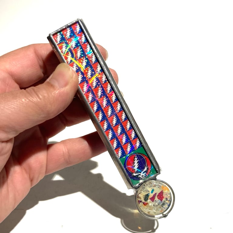 This pocket sized kaleidoscope is made from holographic Grateful Dead blotter art printed by Zane Kesey and Jon Blackburn, with a glow in the dark rainbow jar that you rotate to create the visuals inside. This piece is super fun to carry with you at all times for a new perspective in life ;)