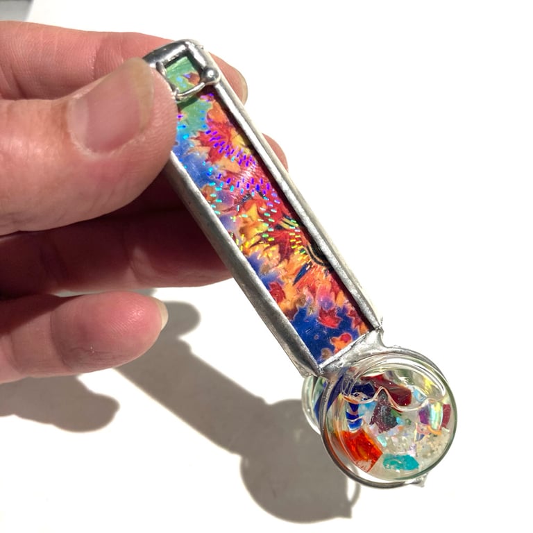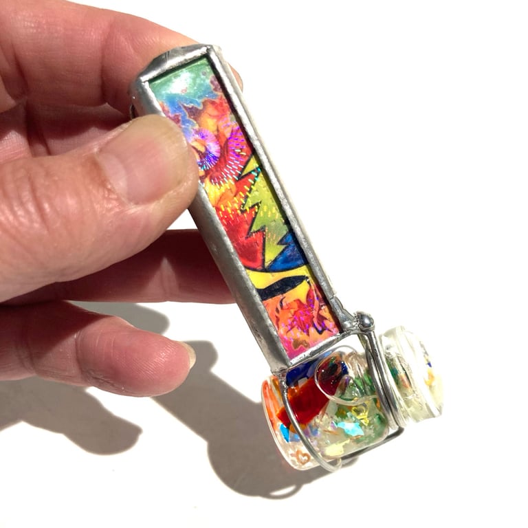 This kaleidoscope necklace is made from holographic Grateful Dead blotter art printed by Zane Kesey, with a glow in the dark rainbow jar that twists to create the visuals inside. It includes a 30" stainless ball chain and mini uv light to charge the glow, and is super fun to carry with you at all times for a new perspective in life ;)