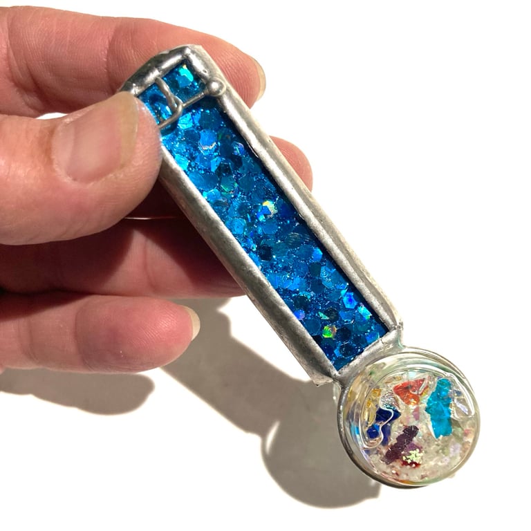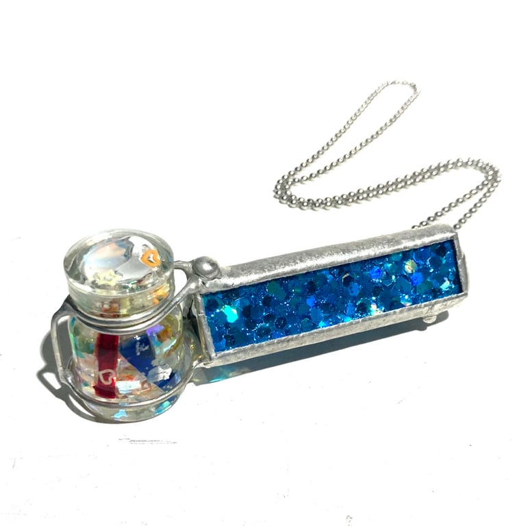 This kaleidoscope necklace is made from turquoise holographic, with a glow in the dark rainbow jar that twists to create the visuals inside.