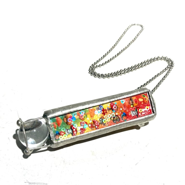This kaleidoscope necklace is made from holographic mushroom blotter art printed by Zane Kesey, with a clear glass marble on the end.