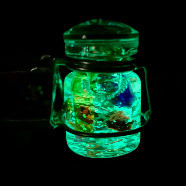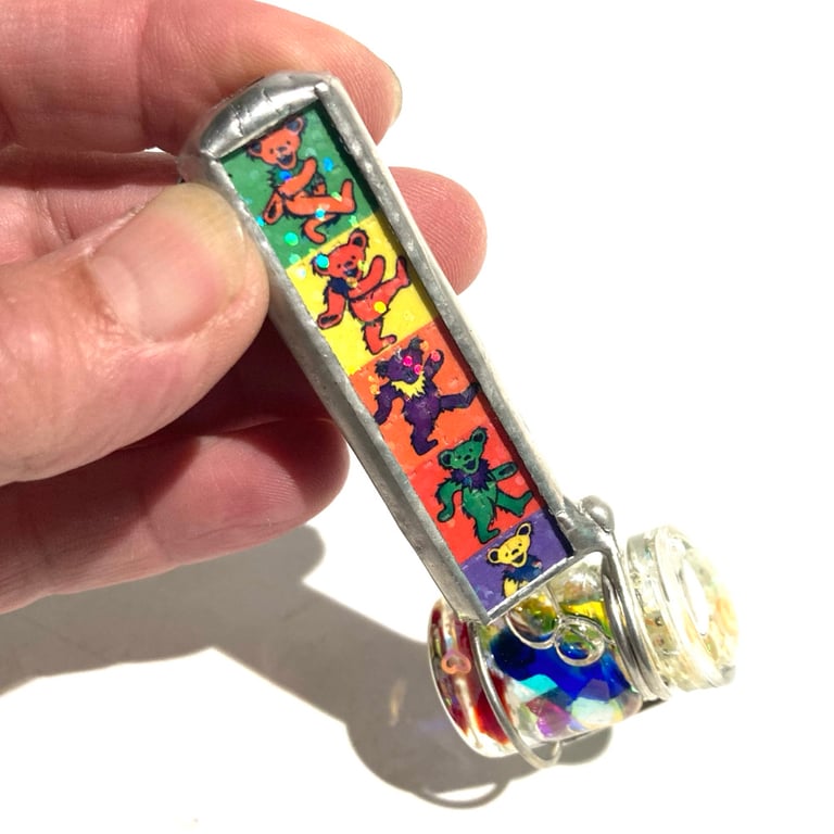 This kaleidoscope necklace is made from holographic Grateful Dead blotter art printed by Zane Kesey, with a glow in the dark rainbow jar that twists to create the visuals inside. It includes a 30" stainless ball chain and mini uv light to charge the glow, and is super fun to carry with you at all times for a new perspective in life ;)